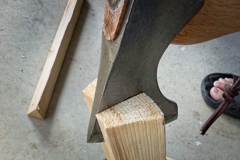 - あらかじめ薪の頭と斧の刃をくっつけたまま薪毎地面に振り下ろすのも比較的簡単に薪を割れました。薪を持つ手に注意!
