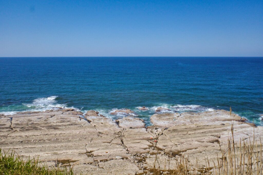 岬の北側の海岸線には、海岸と並行な泥岩の層による洗濯板のような岩石が見えました。