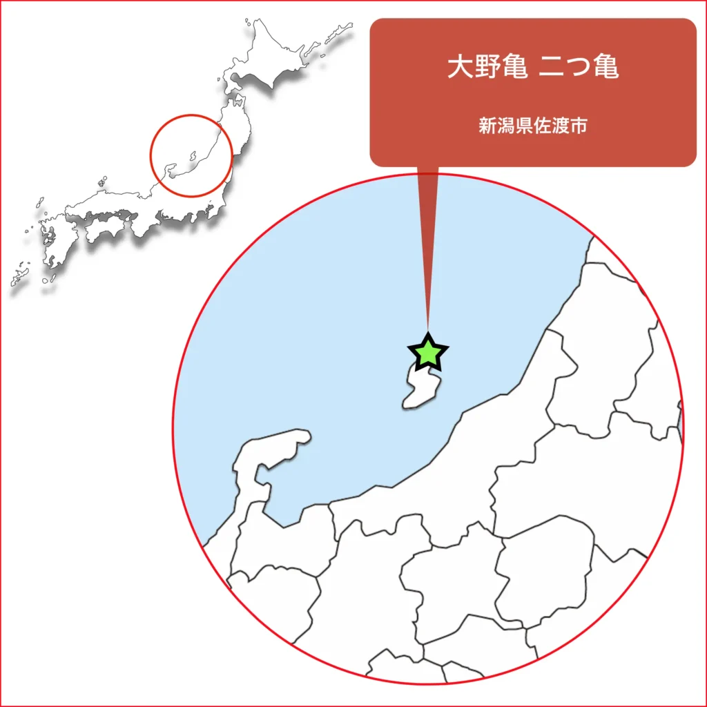 大佐渡の最北端 に位置する二つ亀は、二匹の亀がうずくまっているように見える島です。潮の満ち引きで景色が変わる。