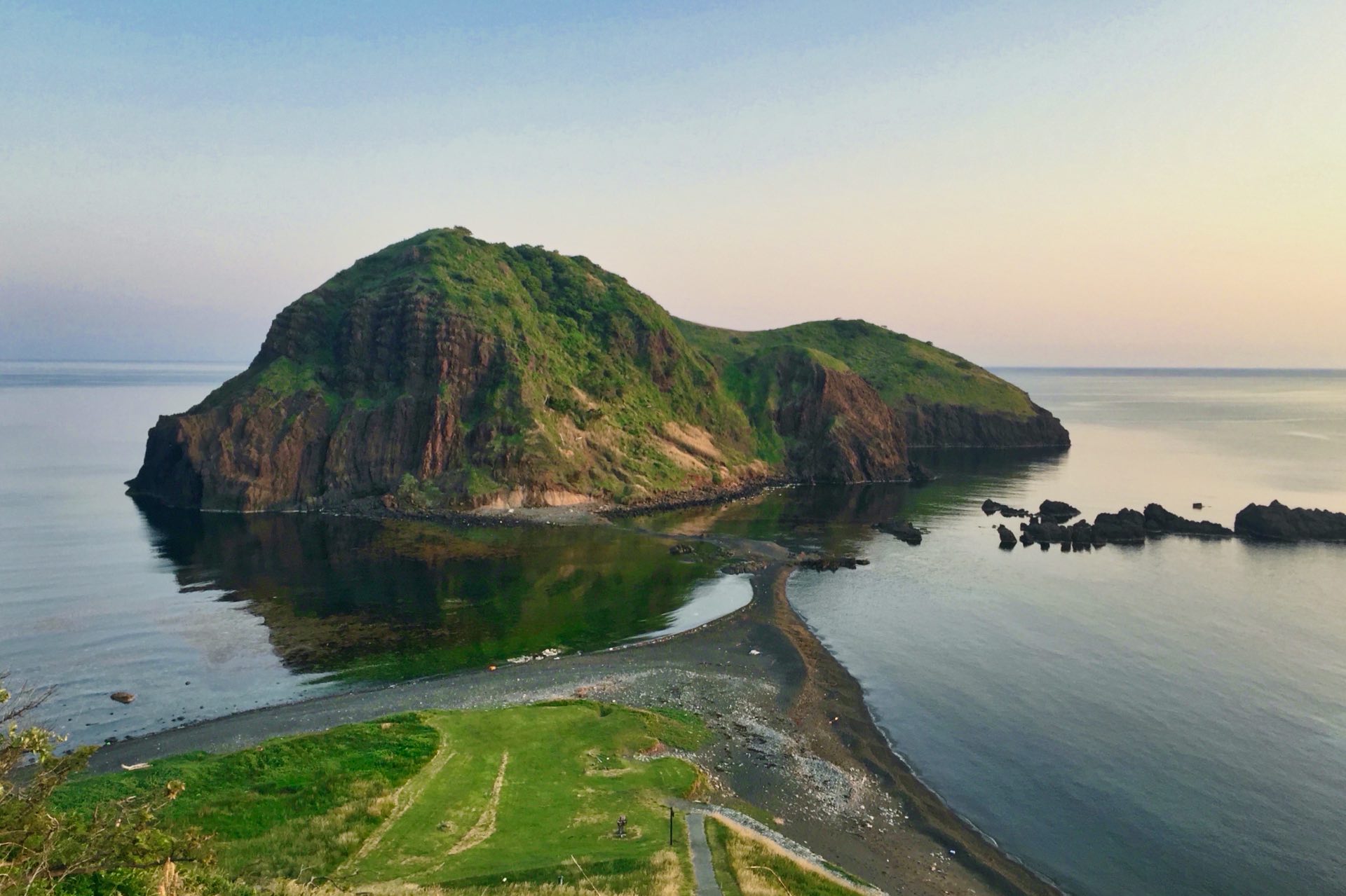 透明な海に浮かぶ2コブの黒い島. ここにある海水浴場は、「全国快水浴場100選」に選ばれています。