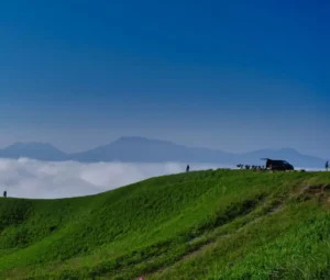 緑の草原に白く光る細い道路と、遠くに阿蘇の火山や噴煙が素敵です。