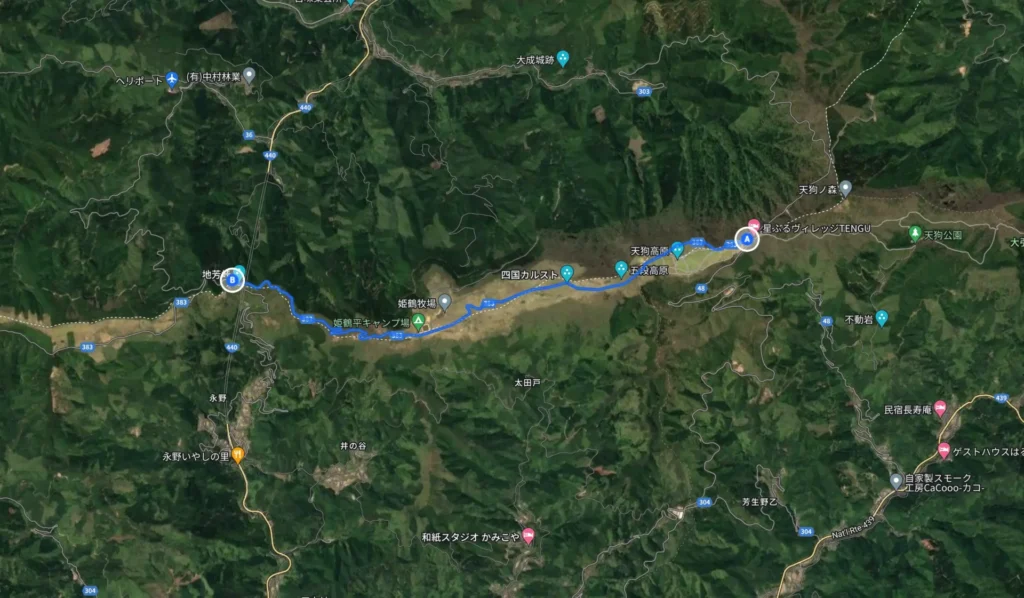 標高1,000m~1,500mの高地からの眺めは絶景で、このカルスト台地を縦断するように通る県道383号(四国カルスト公園縦断線)は絶好のドライブ&ツーリングルートになっています。