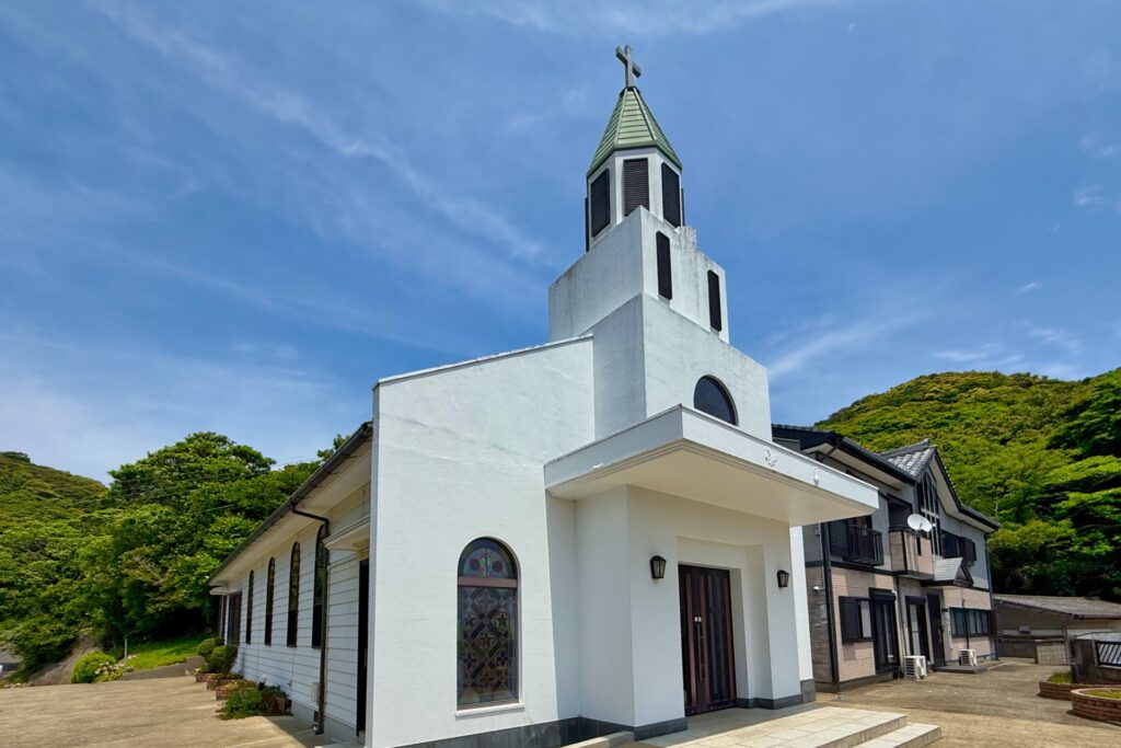 外海地方の出津・黒崎・池島などから移住してきたキリシタンの子孫が住むという。1916年、鉄川与助の設計施工で現教会が建てられた。旧教会は若松島の土井ノ浦に移築されている。現在の教会は、レンガ造りの重層屋根構造、内部は3廊式でリブヴォールト天井をもち、外壁にはレンガの凹凸や色の違いを用いた装飾が行われている。