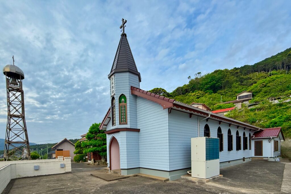 外海地方の出津・黒崎・池島などから移住してきたキリシタンの子孫が住むという。1916年、鉄川与助の設計施工で現教会が建てられた。旧教会は若松島の土井ノ浦に移築されている。現在の教会は、レンガ造りの重層屋根構造、内部は3廊式でリブヴォールト天井をもち、外壁にはレンガの凹凸や色の違いを用いた装飾が行われている。